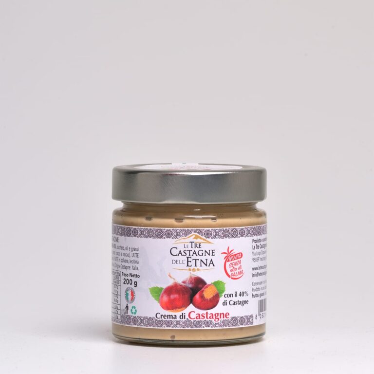 Die Crema di CAstagne (Maronencreme) ist eine süsse und cremige Zubereitung aus gekochten Kastanien,verfeinert mit Zucker, Vanille und Aromen. Sie eignet sich perfekt zum Füllen von Desserts, als Brotaufstrich oder pur als Löffelgenuss. Diese Herbstspezialität überzeugt durch ihren reichen Geschmack und ihre samtige Konsistenz.