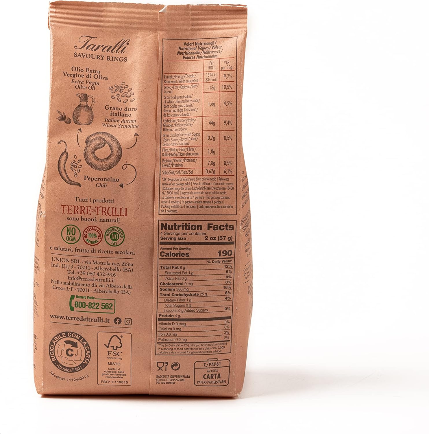 Die Taralli Pugliesi mit Chili sind eine unwiderstehliche Variante der klassischen Taralli, perfekt für Liebhaber intensiver und scharfer Aromen. Hergestellt aus hochwertigen, natürlichen Zutaten wie Olivenöl, Mehl, Weißwein und Chili, bieten diese knusprigen Teigringe eine einzigartige Textur und einen intensiven, würzigen Geschmack. Ideal als Snack, für Aperitifs oder um deine geselligen Momente zu bereichern, bringen unsere Taralli mit Chili den authentischen Geschmack Apuliens direkt zu dir nach Hause. Einfach, aber voller Geschmack – perfekt für alle, die ein intensives Geschmackserlebnis suchen.
